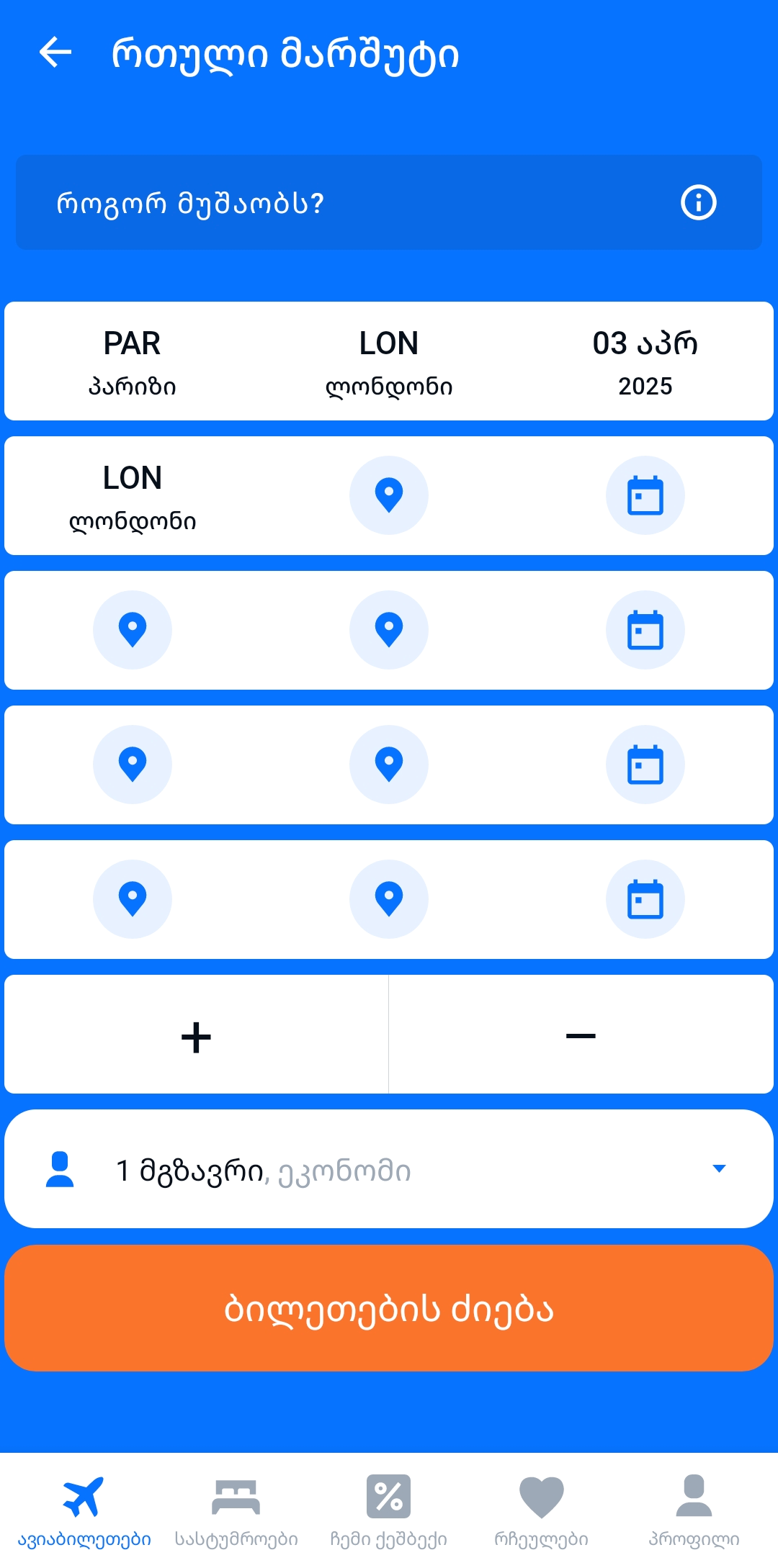ჩვენს ვებგვერდზე, მულტი მარშრუტის ვარიანტი არის ძიების ფანჯრის ქვედა მარცხენა კუთხეში. აპლიკაციაში ის გამოჩნდება მაშინ, როცა დანიშნულების ადგილის არჩევას დაიწყებთ. თქვენ გაქვთ შესაძლებლობა შექმნათ 6-მდე ფრენის მარშრუტი. თქვენი მარშრუტიდან მიმართულების ამოსაღებად, უბრალოდ დააჭირეთ წითელ X ღილაკს მარჯვნივ.