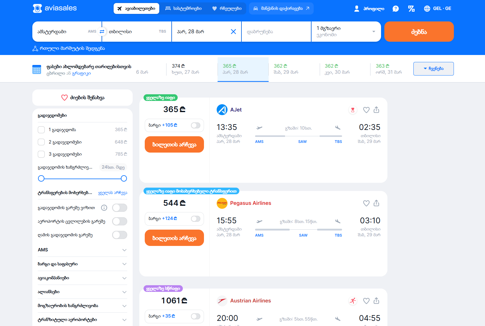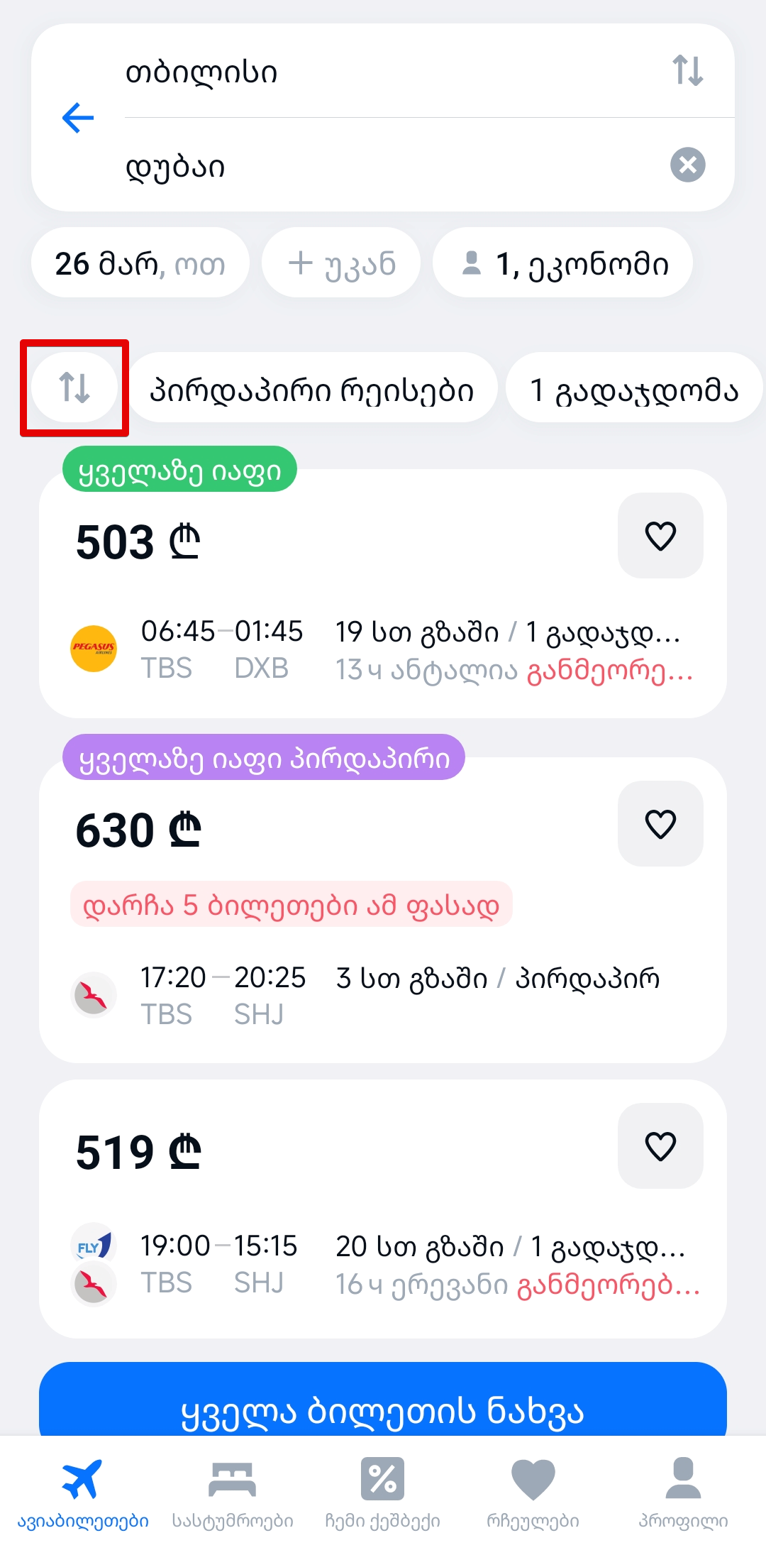 დააჭირეთ „ბილეთების ძებნას“, რათა ნახოთ ყველა ხელმისაწვდომი ვარიანტი, მათ შორის ყველაზე იაფი და მოსახერხებელი ფრენები, რომლებსაც სპეციალურად თქვენთვის გამოვყოფთ შედეგებში. ჩვენ ასევე გაჩვენებთ პირდაპირ ფრენებს, თუ ეს შესაძლებელია, და ფრენის სხვა ვარიანტებს ფასებით, გამგზავრების თარიღებით, მგზავრობის დროებით, აეროპორტებით, გაჩერებების რაოდენობით და ბარგის ფასებით.