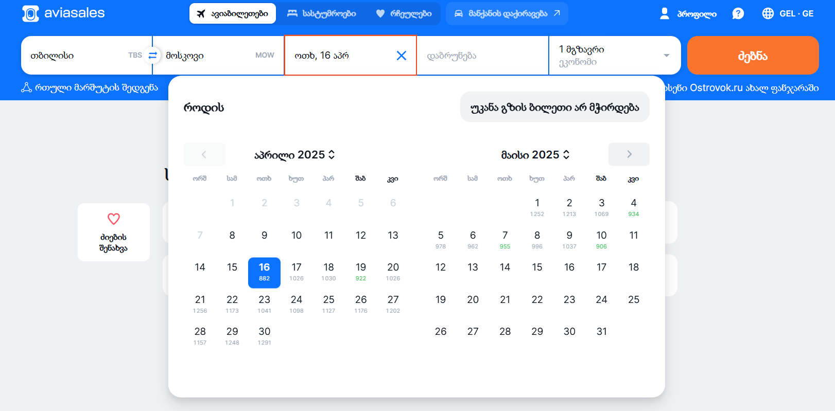 გამოიყენეთ კალენდარი, მწვანე ფერში ნახავთ იმ თარიღებს რომლებშიც ყველაზე იაფია ავიაბილეთები.