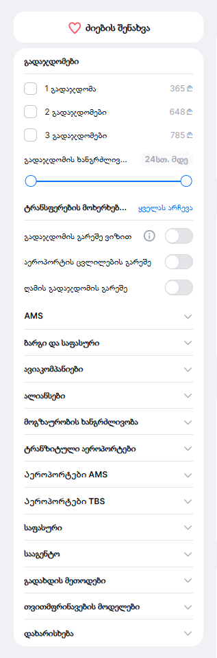 შეგიძლიათ შედეგების მორგება თქვენს მოთხოვნილებებსა და პრეფერენციებზე ფილტრების არჩევით, როგორიცაა გაჩერების რაოდენობა, გამგზავრების და ჩამოსვლის დრო, ბარგის შემწეობა, გაჩერების ხანგრძლივობა, აეროპორტები, ავიახაზები და სხვა.
