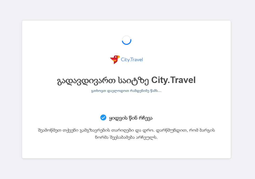გამყიდველის ვებსაიტზე გადამისამართების შემდეგ, რჩება მხოლოდ მგზავრის დეტალების ფორმის შევსება, ტელეფონის მოქმედი ნომერი და ელფოსტის მისამართის შეყვანა და გადახდის მეთოდის არჩევა.