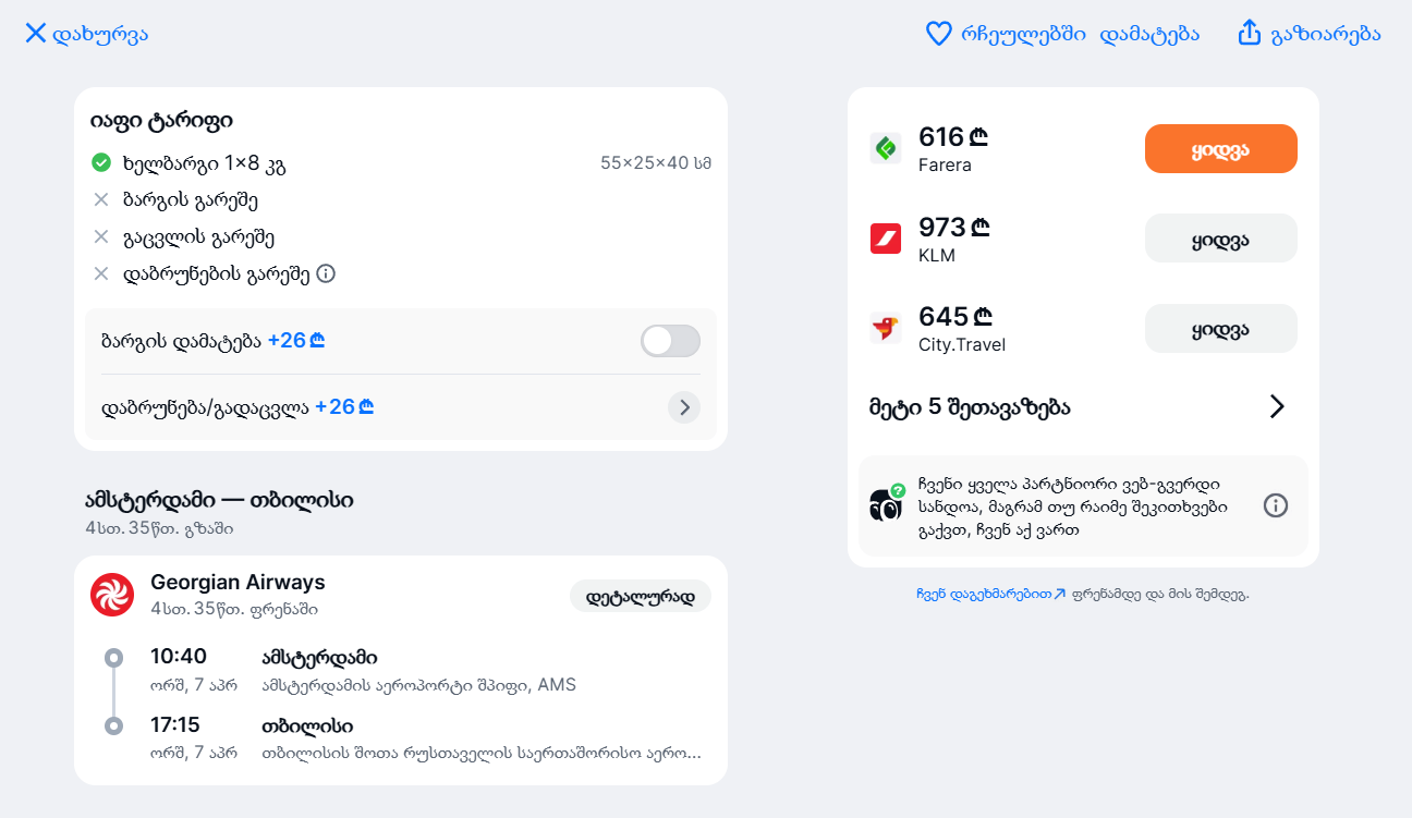 ფრენის პირობებისა და ტარიფის წესების შესახებ მეტი ინფორმაციის სანახავად, რომელსაც ჩვენი პარტნიორები გვიზიარებენ, დააწკაპუნეთ ბილეთზე ან ღილაკზე „ბილეთის არჩევა“.